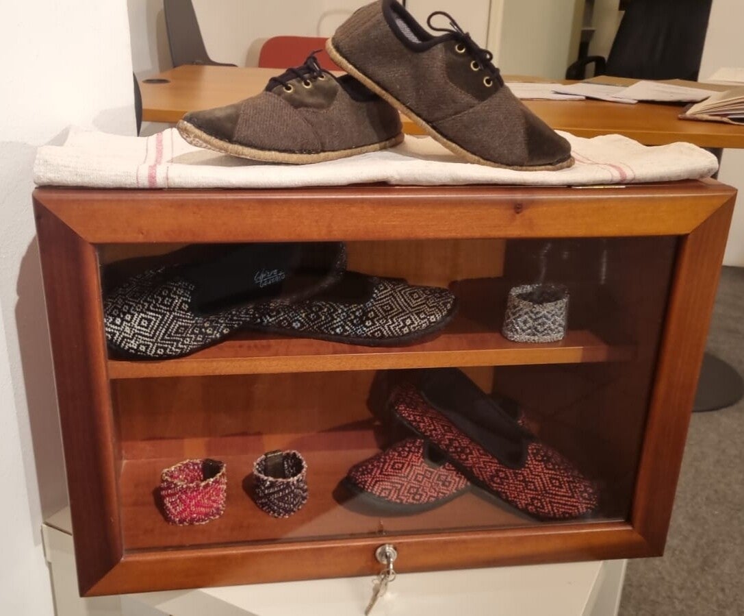 Nella teca, due paia di scarpéss realizzati con stoffa che ho tessuto a telaio con il motivo "piccolo operato".